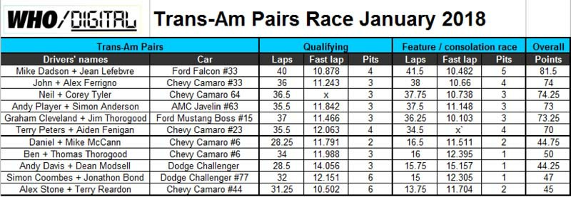 With just five cars in the second heat, the winners would qualify, but everyone else would have to wait nervously for the results of the second race. Ben and Thomas were a couple of laps back with Graham's loaned Penske Camaro. Simon and Jonathon were looking precarious in the wonderful lime green Posey Challenger, just ahead of Alex and Terry's Pioneer Camaro. Andy D and Dean's Dodge was back on 28.5 laps.